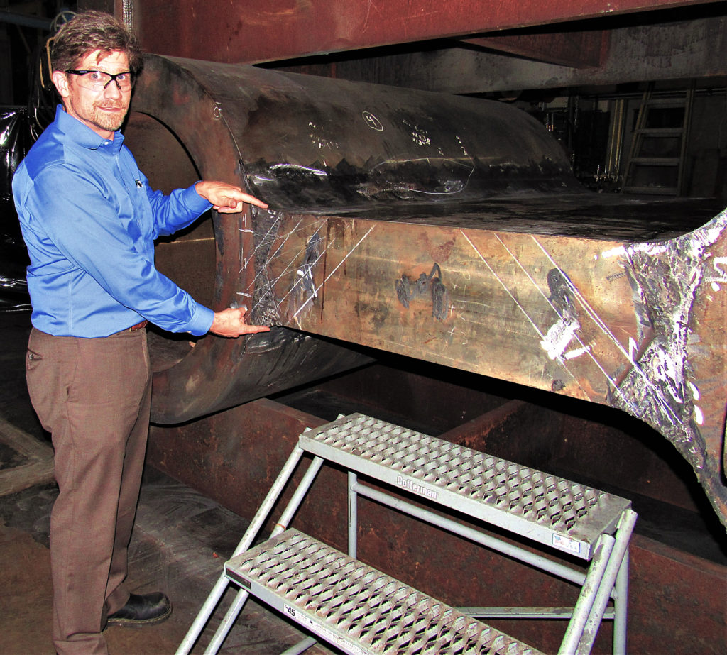 - Butech Bliss vice president Jock Buta demonstrates the depth of the special-process, heavy-steel welding required to mate two pieces of a large forged press head together. Two of the forged press heads are currently under construction at the Butech Bliss “633 building” on S. Broadway Avenue. The pieces shown here — the connecting bar and the cylinders — each have to be pre-heated to 200-300 degrees before being welded together and processed at Butech Bliss’s new weld station. (Salem News photo by Larry Shields)
