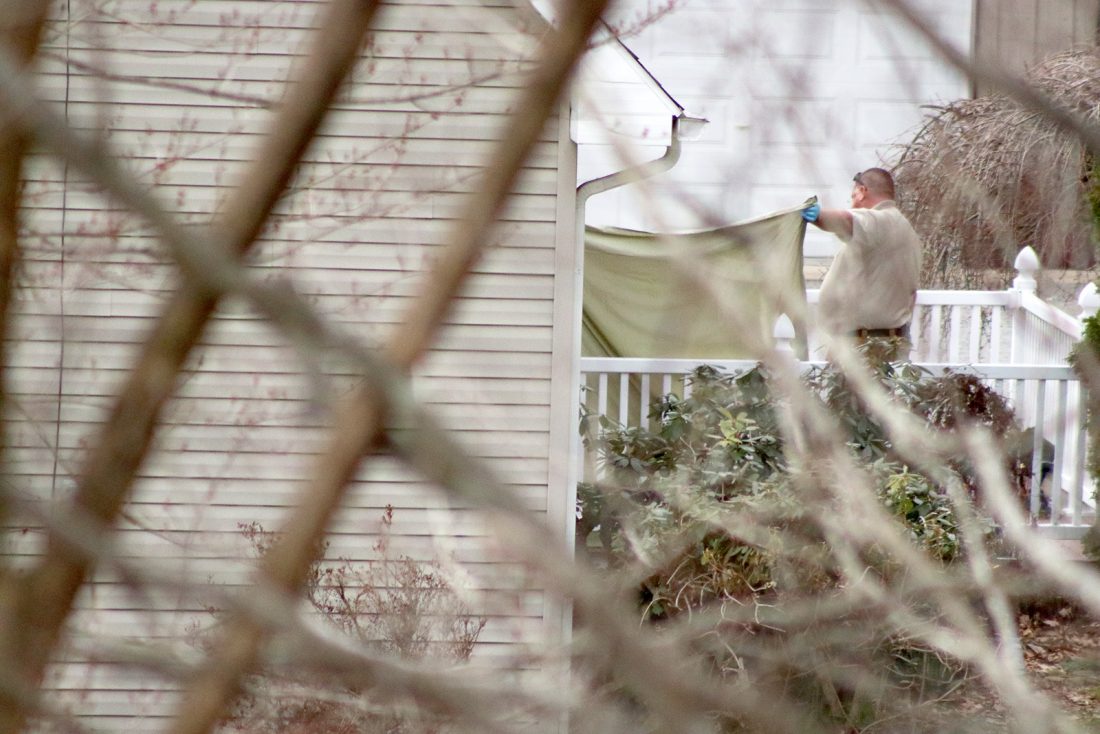 Columbiana County Sheriff Brian McLaughlin holds up a sheet on the porch while investigators from the Ohio Bureau of Criminal Investigation gather evidence at the Depot Road home of MaryAnn McGuire, who was shot and killed in the county’s second homicide of the year. (Salem News photo by Deanne Johnson)