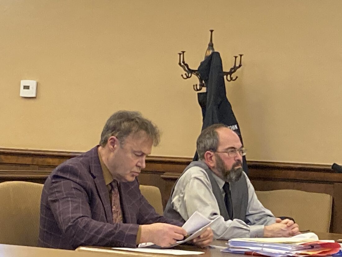 Robert M. Greenisen of Salem, right, sits with his defense attorney, Chris Amato, during his sentencing Friday for trying to bribe a judge. The funeral director and licensed embalmer for Arbaugh Pearce Greenisen and Sons Funeral Home was placed on probation under community control for three years, but must serve 90 days in jail. (Salem News photo by Mary Ann Greier)