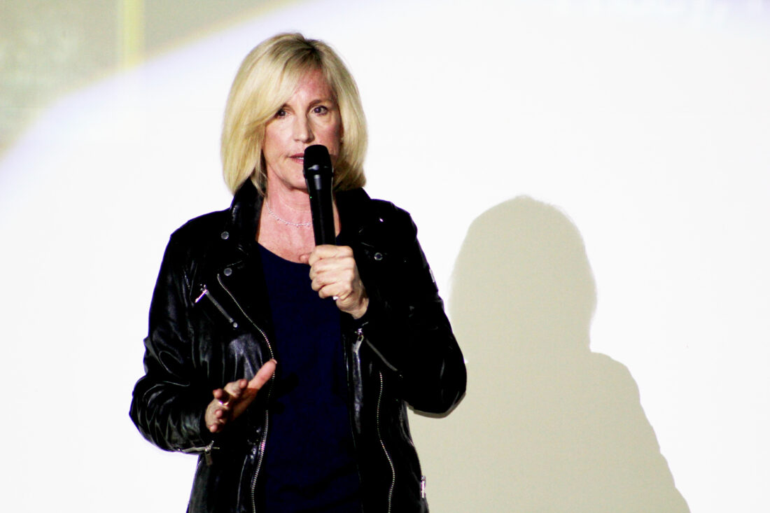 Environmental advocate Erin Brockovich addresses the crowd at Columbiana’s theater on Thursday in her second town hall meeting in the area since the Norfolk Southern train derailment. (Photo by Stephanie Elverd)