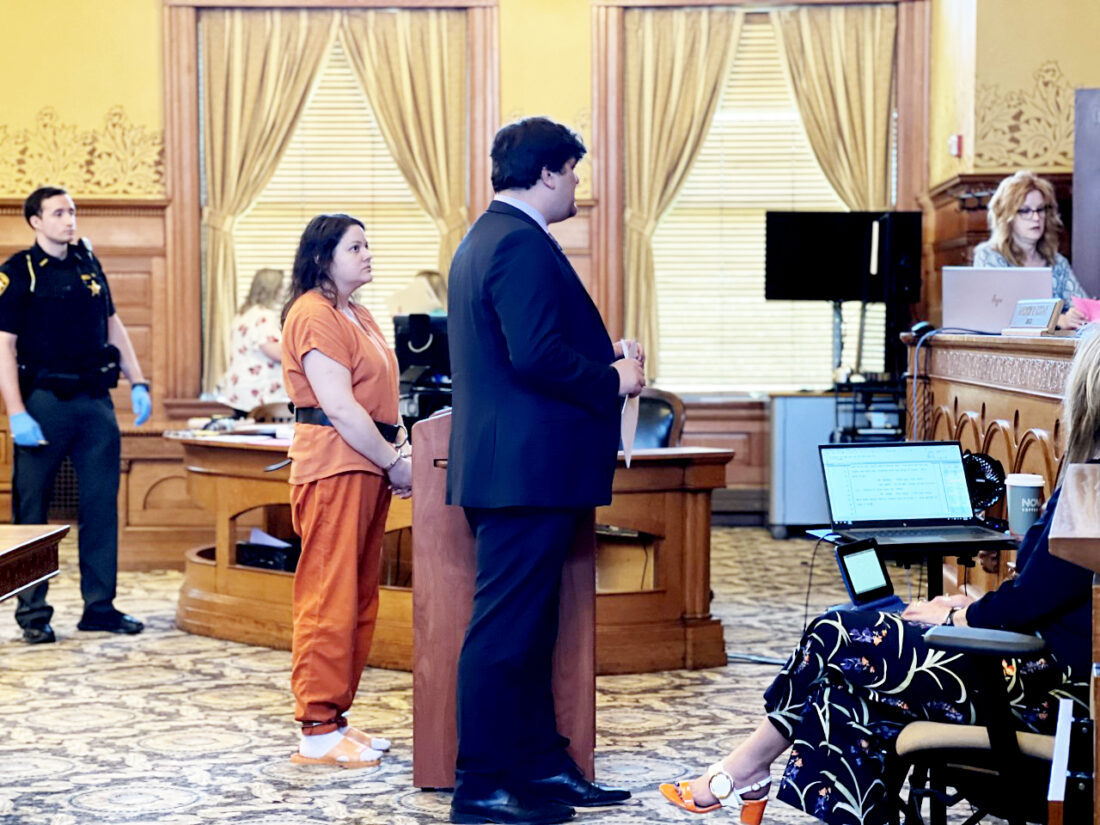 Kristen Kuhns, left, stands Tuesday next to defense attorney Alexander Keane, before Trumbull County Common Pleas Judge Andrew D. Logan. Keane was filling in for Kuhn’s attorney, Carlo A. Ciccone. (Photo by Chris McBride)