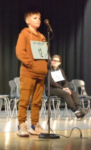 - Lisbon fifth-grader and winner of the Lisbon Spelling Bee Friday, Braidon Davison, prepares to spell a word in one of the final rounds as fourth-place finisher, seventh-grader Ashden Donaldson, looks on. Davison seemed to breeze through his spellings without hesitation during the competition. (Photo by Evan Houk)