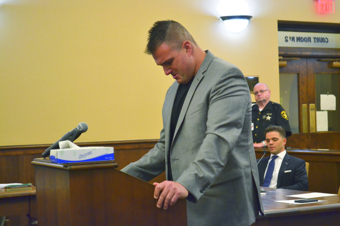 Boardman area contractor, John P. Bartos, 41, Youngstown, breaks down during an emotional final statement “begging” Judge Scott Washam to avoid jail time in his sentencing on three counts of theft by deception during his sentencing hearing in Columbiana Common Pleas Court Friday, saying he is a “changed man.” Bartos was sentenced to 90 days in jail for taking a total of $8,500 from three different clients and not performing the promised work of installing doors and windows in Columbiana County from Feb. 2022 to Jan. 2023. (Photo by Evan Houk)