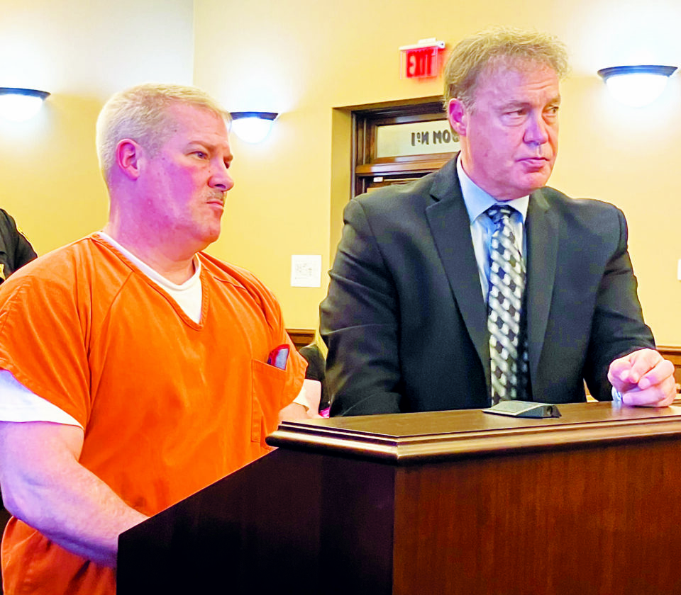 Charles Bogart Jr. stands at the podium with his defense attorney, Chris Amato, pleads guilty in Columbiana County Common Pleas Court. He was sentenced to 16 years in prison for killing William “Sonny” Young during the commission of a burglary in 2010. (Photo by Mary Ann Greier)
