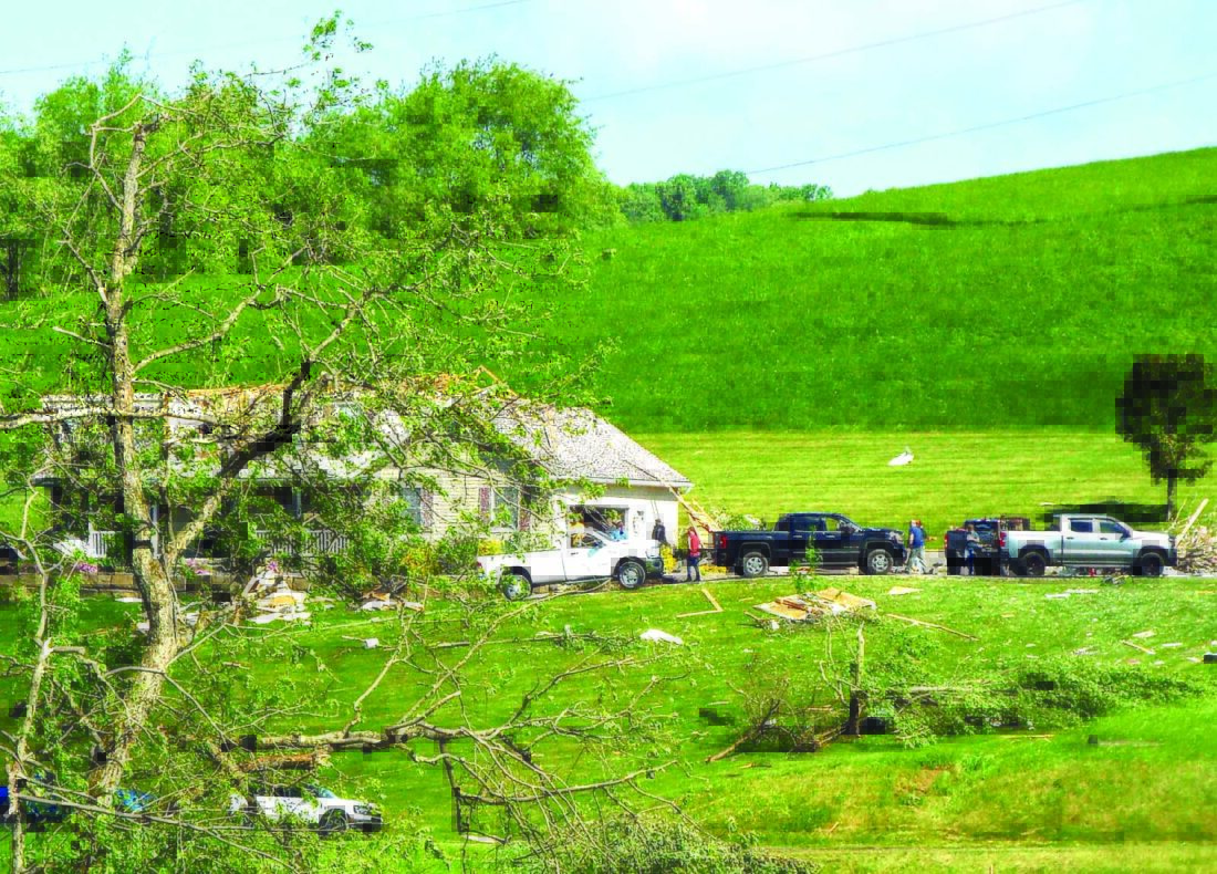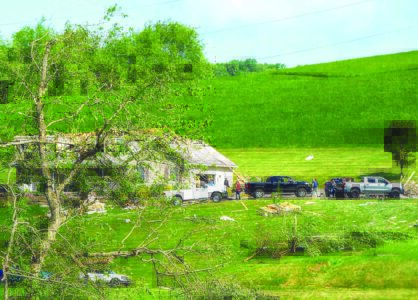 - Officials investigate damage to a house in the 100 block of Independence Drive that was damaged by a tornado early Wednesday morning in the Fairhaven area of Hancock County. The property owners fared better than their neighbor, whose farm is virtually just a debris field now. (Photo by Stephanie Ujhelyi)