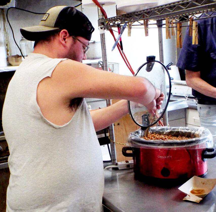 Billy Garlough puts some finishing touches on some baked beans to be served as a side dish option at the Leetonia ITAM fish fry, which is held weekly through Good Friday. (Photo by Stephanie Ujhelyi)