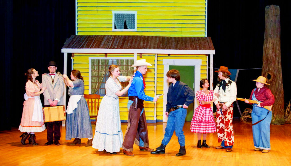 Salem High School’s spring musical, “Oklahoma,” will be held this weekend. Pictured from left, cast members Lilly Hill as Gertie; Nathan Fowler as Ali Hakim; Kisha Leland as Aunt Eller; Camryn Mark as Laurey; Luke Davis as Curly; Alex DeRienzo as Jud; Lana Tonkinson as Ado Annie; Logan Bricker as Will; and Ina Fryfogle as Carnes. (Submitted photo)