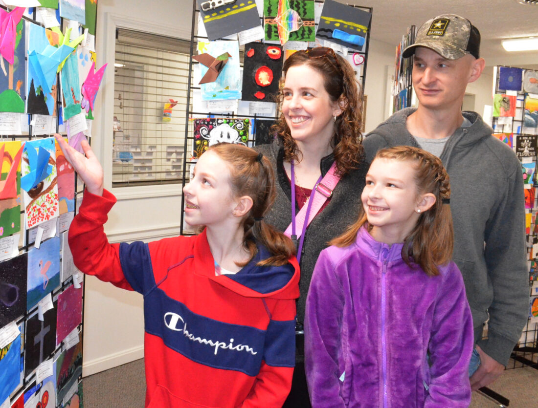 The Salem Chamber of Commerce was the locale Saturday for a Gallery of Art featuring submissions from across our area created by the young and old. The program was the debut of “Inspired by Burchfield,” honoring the legendary Salem artist, Charles Burchfield. Shown above, from left, Crestview student Allie Newton points to her artwork while family members look on including her parents, Kelly and Dan, and sister, Sydney. (Photo by J.D. Creer)