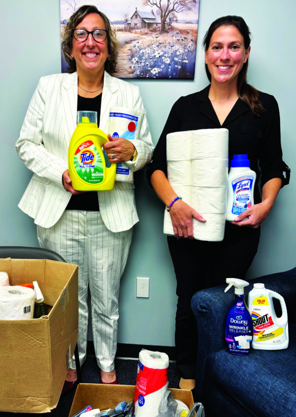 Dr. Jill Hendrickson, left, psychologist and behavioral health director, and Jenna Wonner, COO of CAA’s Health, Behavioral Health and Dental Centers, show hygiene, paper and household products collected during this year’s National Health Center Week. Employees at CAA’s sites had the option to donate items to benefit the Health Center of Columbiana County’s Behavioral Health Clothing/Housewares Closet located inside the CAA Behavioral Health Center, Building 2, in Calcutta. The items collected will benefit CAA clients in need. (Submitted photo)