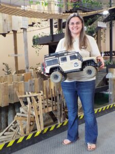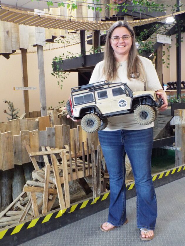 - Julie Brammer, who co-owns Rocky Top RC with her husband, holds one of the business’ large remote control vehicles that runs on its large RC course Tuesday. The new indoor RC crawler recently opened in Oakmont Plaza in Columbiana next to Domino’s Pizza. (Photo by Stephanie Ujhelyi)