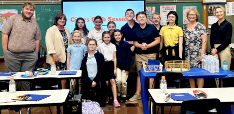 Salem Mayor Cyndi Baronzzi Dickey speaks with students at the St. Paul School Civics Club Friday. From left, front row, Jean Bahr, Reagan Bails, Lillian Rickard, Chloe Santee; back row, Social Studies Teacher Michael Godfrey, Dickey, Addalynn Kimball, Rosemary DellaMaggiore, Lacey Lindesmith, David Prosko, Jackson Hovanic, Austin Lindesmith, Katherine Lawrence, Retired Superintendent Mary Fiala, and Club Sponsor Emmy Prosko. (Submitted photo)