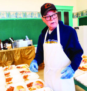 Howard Reynolds, who helps his wife Denise, coordinate Shepherd’s Table meal offerings for the Community Resource Center on Mondays, Wednesdays and Fridays, inserts helping of chips or pretzels in the carryout meal containers Monday. Appreciative diners waited in line for around an hour before doors were open, so they could retrieve their meals. (Photo by Stephanie Ujhelyi)