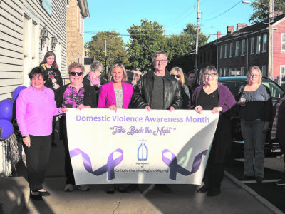 Participants in the annual Take Back the Night Walk in Lisbon for Domestic Violence Awareness Month prepare to trek through downtown Lisbon Thursday night. Holding the banner from left are Catholic Charities Regional Agency Executive Director Nancy Voitus, Christina House Program Manager Debbie Chaffin, 79th district state Rep. Monica Robb Blasdel, R-New Waterford, Lisbon Mayor Peter Wilson and Christina House Outreach Coordinator Nickie Ostick. (Photo by Mary Ann Greier)