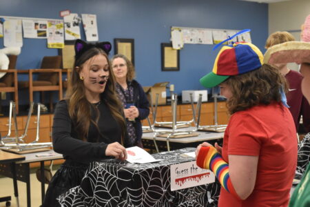 CCCTC Criminology student Addie Green of Beaver Local (left) mans the “Guess the Guts” booth while Lora Stanley of Wellsville reaches in the mystery box.