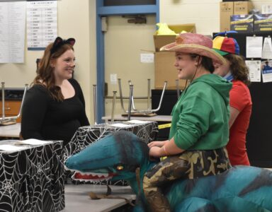 CCCTC Criminology student Connor Plunkett of Salem shares a laugh with Koleigh Fodden (right) and Lora Stanley (center) at the “Guess the Guts” booth.