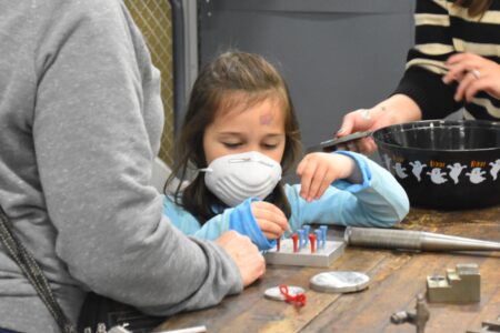 Elena Wilson (5) of Columbiana plays a game of tic-tac-toe in the CCCTC’s Precision Machining and Manufacturing Department while wearing the mask she received in from Auto Collision Repair students.