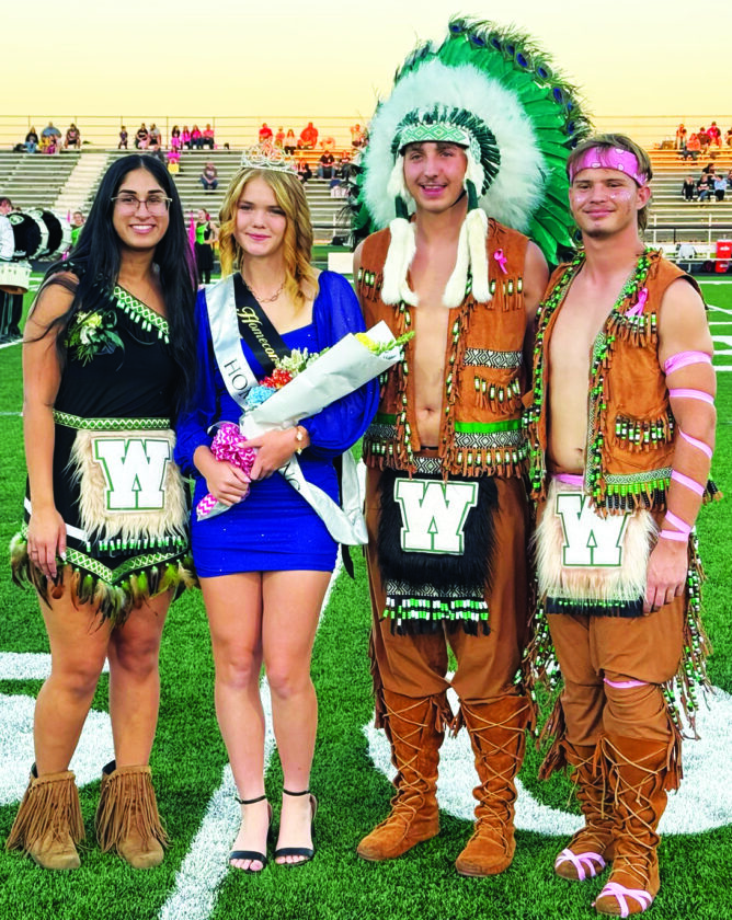 Ciara Evans was honored Friday as West Branch High School’s Fall Homecoming Queen. She is flanked by Warrior Princess Arya Patel, Warrior Chief Dakota Cutlip and Warrior Assistant Mason Runk. (Submitted photo)