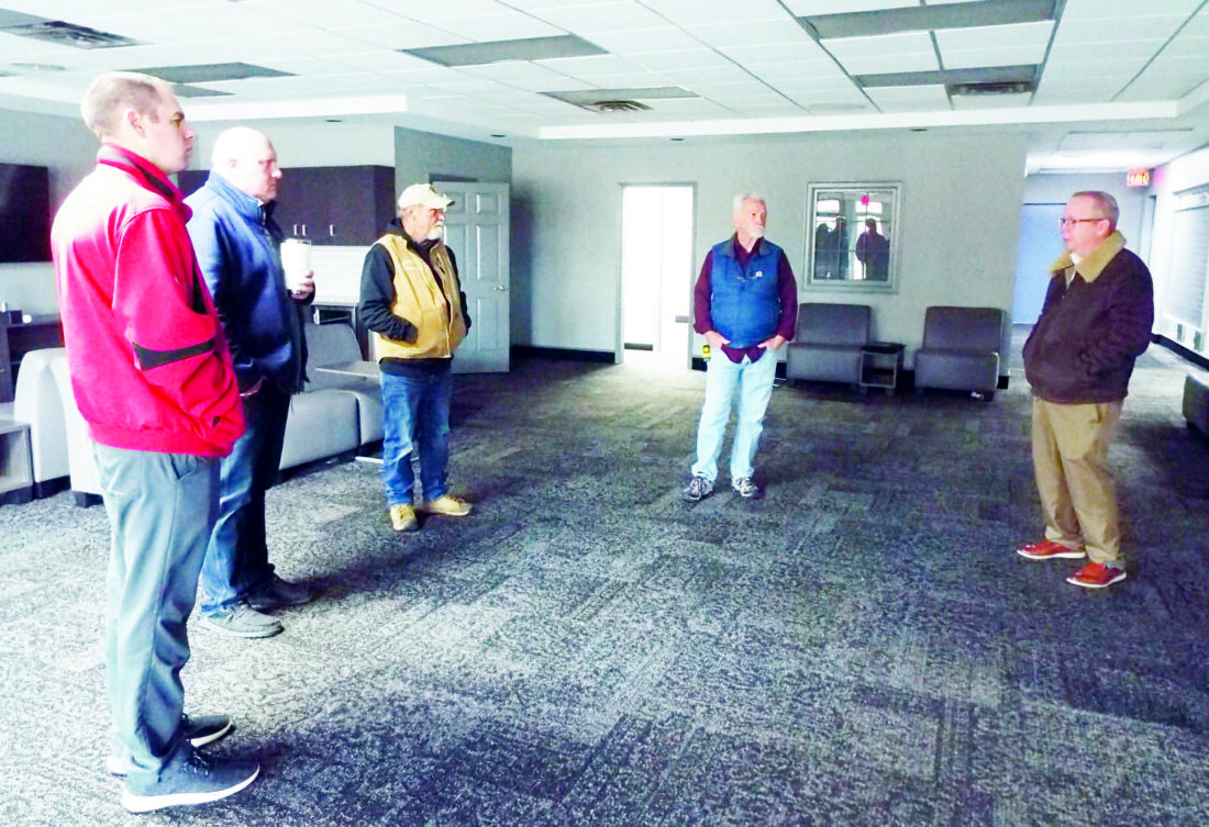 - From left, Columbiana deputy city administrator Bryce Miner, councilman Robert Quetot, service director Jesse Wilson and council president “Skip” Liston listen to city manager Lance Willard speak before they begin Friday’s tour of the soon-to-be-new-to-them city building, as they all stand in the former service center of the dealership. (Photo by Stephanie Ujhelyi)