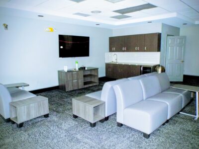 Previous building occupant #1 Cochran left a variety of office furniture when it vacated 21 E. Railroad St. in October, including this furniture and fixtures in the lounge portion of the service waiting area. A large amount of professional quality desks, credenzas, chairs and shelving also remains. (Photo by Stephanie Ujhelyi)