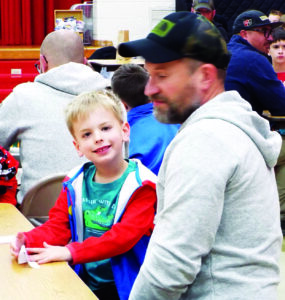 Owen Klenotic, 5, sits next to dad Luke Klenotic, of Salem, Friday, Oct. 3, during the initial All-Pro Dads monthly meeting of the 2025-26 school year at Joshua Dixon Elementary School. Students enjoyed breakfast and a moral lesson as part of the curriculum. (Photo by Stephanie Ujhelyi)