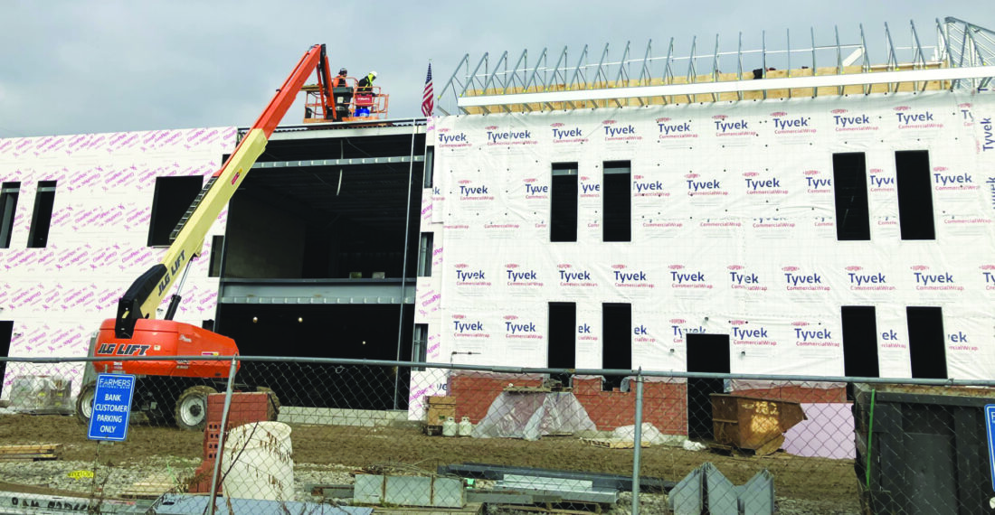 Workers continue construction on the roof area of the Columbiana County archive/records building on East Chestnut Street in Lisbon where the American flag can be seen flying. The contractor is C. Tucker Cope Design-Build Inc. of Columbiana. County Commissioner Tim Ginter said completion is expected in mid-2026. (Photo by Mary Ann Greier)