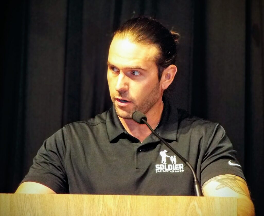 - Featured speaker Nicholas Clemmer addresses attendees of the Columbiana Middle/High Schools Veterans Day assembly Friday. Clemmer had served as a U.S. Army specialist in the Iraqi theater before relocating to Columbiana, where he is a volunteer with the school system and local athletics. (Photo by Stephanie Ujhelyi)