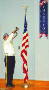 - Columbiana American Legion 290 member Drew Kinard performs Taps during the joint Veterans Day assembly held by Columbiana Middle and High schools in the district auditorium Friday. (Photo by Stephanie Ujhelyi)
