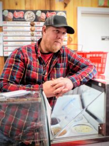 Craig Dunlap of Hanoverton poses with some of his Craig’s Shirt Shack inventory Friday while vending at Woolf Farms in Salem. Dunlap and other invited artisans were located in a heated tent attached to the main farm store during this weekend’s Country Roads Tour. In addition to browsing the store’s inventory, visitors could sample the ice cream, chips or apple varieties; and take a selfie with either Santa or the Grinch. The event continues today. (Photo by Stephanie Ujhelyi)