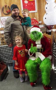 The McCrady family from East Rochester poses with the Grinch for a photo Friday while visiting Woolf Farms of Salem as part of a Christmas shopping tour. Pictured are clockwise from bottom right, the Grinch, 5-year-old Emma McGrady and dad Chris McGrady holding 2-year-old Grady. In addition to browsing the store’s inventory, visitors could sample the ice cream, chips or apple varieties; also take a selfie with Santa; or visit an attached vendor event and check out their items for sale. The event continues today. (Photo by Stephanie Ujhelyi)