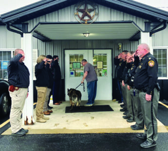 Sheriff Brian McLaughlin and members of the Columbiana County Sheriff’s Office and Salem Police Department, including K-9 handlers from both departments, salute retired Deputy K-9 Jesy, with her handler and friend, retired sheriff’s office Lt. Allan Young. The first K-9 for the department, K-9 Jesy ended her watch Tuesday afternoon, passing away with her Young family and sheriff’s family by her side. (Photo by Mary Ann Greier)