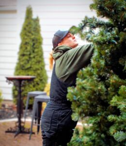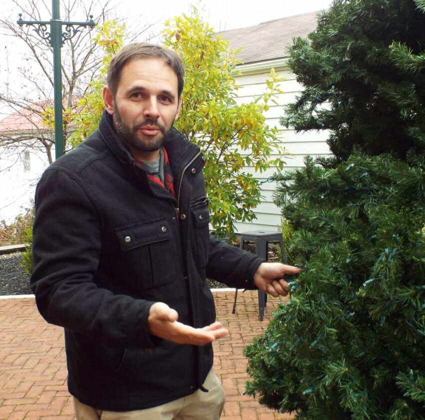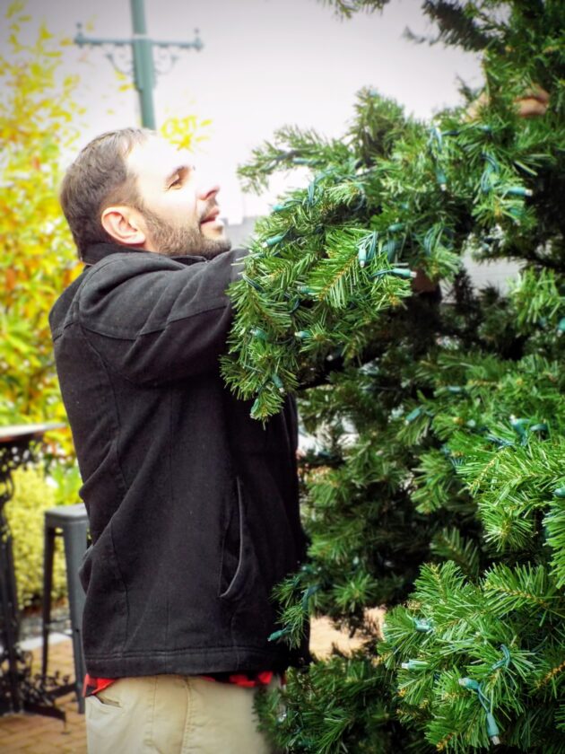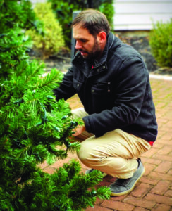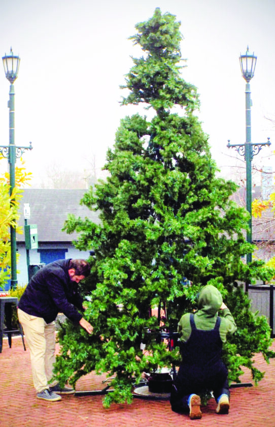 - Leetonia mayor Kevin Siembida fluffs the branches on the village’s Pocket Park tree, which is being decorated in preparation for Saturday’s Light Up Night. (Photo by Stephanie Ujhelyi)
