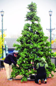 - Leetonia mayor Kevin Siembida and his administrative assistant Hailey Taylor fluff up the branches, after putting up the village trees and hanging lights Thursday in preparation for Saturday’s Light Up Night festivities. (Photo by Stephanie Ujhelyi)