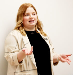 - Lori Colian tells students the story of how she began working in social and mental health services to help people, eventually becoming the executive director of the Columbiana County Mental Health and Recovery Services Board. She also told students that jobs in the field are currently plentiful as the demand for mental health and behavioral service professionals continues to surpass the available skilled workforce. (Photo by Morgan Ahart)