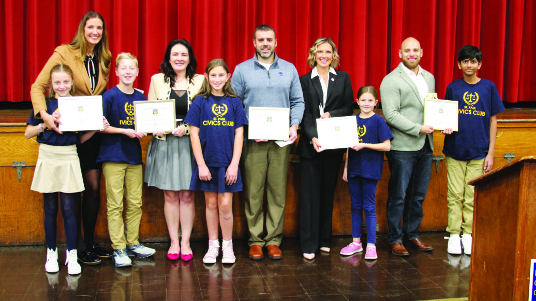 - Following their presentations the members of St. Paul’s Civics Club presented the elected officials with certificates of appreciation and replicas of the Constitution signed by all the club members. Shown from left are Ohio Seventh District Court of Appeals Judge Katie Dickey, Lacey Lindesmith, Austin Lindesmith, Mahoning County Court Judge Molly Johnson, Rosemary Dellamaggiora, Columbiana County Prosecutor Vito Abruzzino, Ohio Representative Monica Robb Blasdel, Lillian Rickard, Ohio Senator Al Cutrona, Aadi Patel. (Photo by Morgan Ahart)