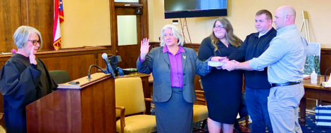 - Seventh District Court of Appeals Judge Carol Ann Robb administers the oath of office to new Columbiana County Common Pleas Court Domestic Relations Magistrate Tammie Riley Jones, while her children, Katie, Steven and David Jones hold the Bible during a celebration Friday at the downtown courthouse in Lisbon. (Photo by Mary Ann Greier)