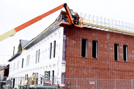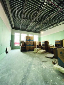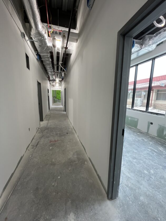 Hammond Construction employees carry freshly cut pieces of drywall through the cement block hallways of the large building taking shape on Crestview Road.