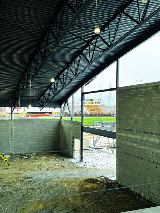 - The existing football field and grandstand can be seen from the competition gym mezzanine being constructed. (Photo by Katie White)