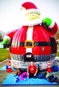 Annie Jesiolowski, 5, and Gabe Pastore, 8, take a breather Saturday, after exiting the Santa bounce house at the village of Leetonia’s light-up festivities. The chldren were with their mother, Sandra Johns of Leetonia. The event also included a tree lighting later in the Pocket Park nearby as well as carriage rides, an ice skating rink, a Santa inflatable selfie chair and caricature artist as well as refreshments like hot cocoa, cupcakes and cookies —at no charge to attendees. (Photo by Stephanie Ujhelyi)