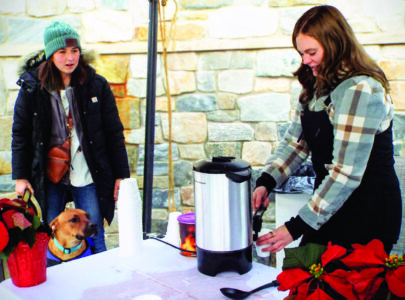 - From left, Emma Huffman of Salem brought 1-year-old Kip to visit his “mom” Hailey Taylor, who was busy making hot cocoa and manning the basket drawing fundraiser for her boss during Saturday’s Leetonia Light Up Night at the splash pad. Huffman was dog-sitting for Taylor. Village residents as well as tourists turned out for the official tree lighting in village park as well as to enjoy the Santa bounce house, ice skating rink, carriage rides, a Santa inflatable selfie chair and caricature artist. (Photo by Stephanie Ujhelyi)