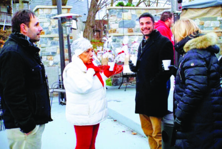 From left, Emma Huffman of Salem brought 1-year-old Kip to visit his “mom” Hailey Taylor, who was busy making hot cocoa and manning the basket drawing fundraiser for her boss during Saturday’s Leetonia Light Up Night at the splash pad. Huffman was dog-sitting for Taylor. Village residents as well as tourists turned out for the official tree lighting in village park as well as to enjoy the Santa bounce house, ice skating rink, carriage rides, a Santa inflatable selfie chair and caricature artist. (Photo by Stephanie Ujhelyi)