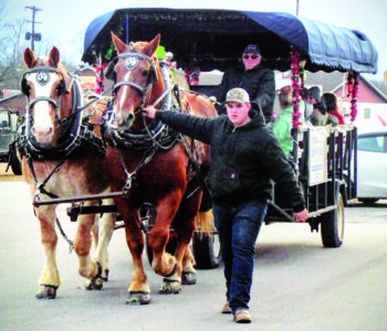 An employee from Friendship Hill Equine Services of Midland, Pa. leads a group on a carriage ride Saturday afternoon during Leetonia’s Light Up festivities. Village residents and tourists turned out for the official tree lighting in village park as well as to enjoy the Santa bounce house, ice skating rink, a Santa inflatable selfie chair and caricature artist. (Photo by Stephanie Ujhelyi)