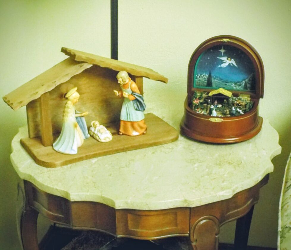 - Two gifts that Pastor Kari Lankford received for her nativity collection included this Hummel nativity, on left from Vivian’s Collectibles in Columbiana, and this music box from her mother, who acknowledged her contribution to Lankford’s habit. Both along with the other 350-plus sets are on display at the church that Lankford pastors, St. Paul’s Lutheran Church in Leetonia. (Photo by Stephanie Ujhelyi)