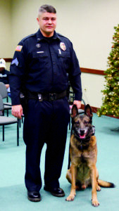 K-9 Simon officially retired on Dec. 3, 2024, after nearly a decade of dedicated service to the city of Salem and a well-deserved commendation from the city council. On Friday, a procession and memorial service will be held at the high school to honor his life and service at 3 p.m. Shown are Sgt. Mike Garber and Simon waiting to receive the commendation. (File photo by Morgan Ahart)