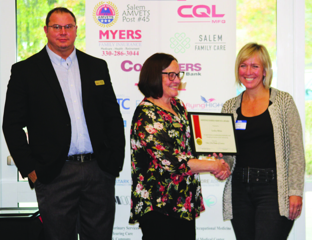The Salem Area Chamber of Commerce convened for its 79th annual meeting at the Salem Community Center Wednesday. Each year the chamber’s member businesses and Executives meet to recognize the service of the chamber’s outgoing members of the board of directors and select their successors and to present the annual citizen, small business, large business, and non-profit of the year awards. Debbie Leggett accepts the Citizen of the Year Award. Shown from left are Chamber of Commerce Executive Director Alicia Johnston, Leggett, and Chamber Treasurer Doug Falk. (Photo by Morgan Ahart)