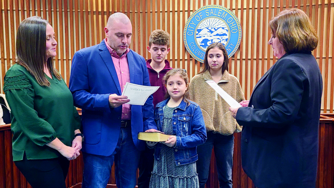 At-Large Salem City Councilman-elect Trent Tice was administered his oath of office for his upcoming city council term by Mayor Cyndi Baronzzi Dickey Tuesday. Tice will officially begin his term as councilman in January. Shown from left are Krysten, Trent, Taven, Tori, and Taryn Tice, and Dickey. (Photo by Morgan Ahart)
