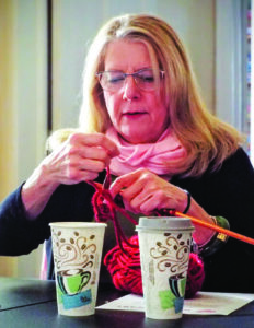 - Jane Hackathorn, of Columbiana, works on a knitted scarf Monday for HeartScarves during a work day at the Columbiana County Seniors’ clubhouse. The scarves are collected and forwarded to North Carolina for distribution to heart disease survivors. Another work day is scheduled for Jan. 26 at the clubhouse. (Photo by Stephanie Ujhelyi)