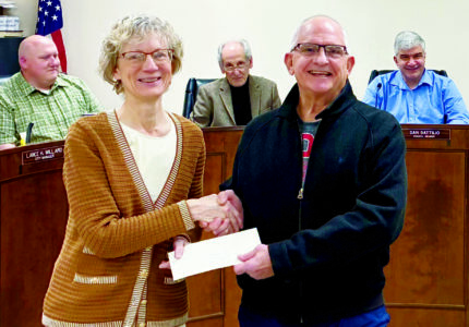 The Columbiana Community Foundation awarded a grant of $3,500 to the City of Columbiana for the summer concert series at Firestone Park. Pictured are Park Board member Greg Gustafson, right, and Deann Davis of the Community Foundation. Visit columbianacommunityfoundation.com for information on the foundation. (Submitted photo)