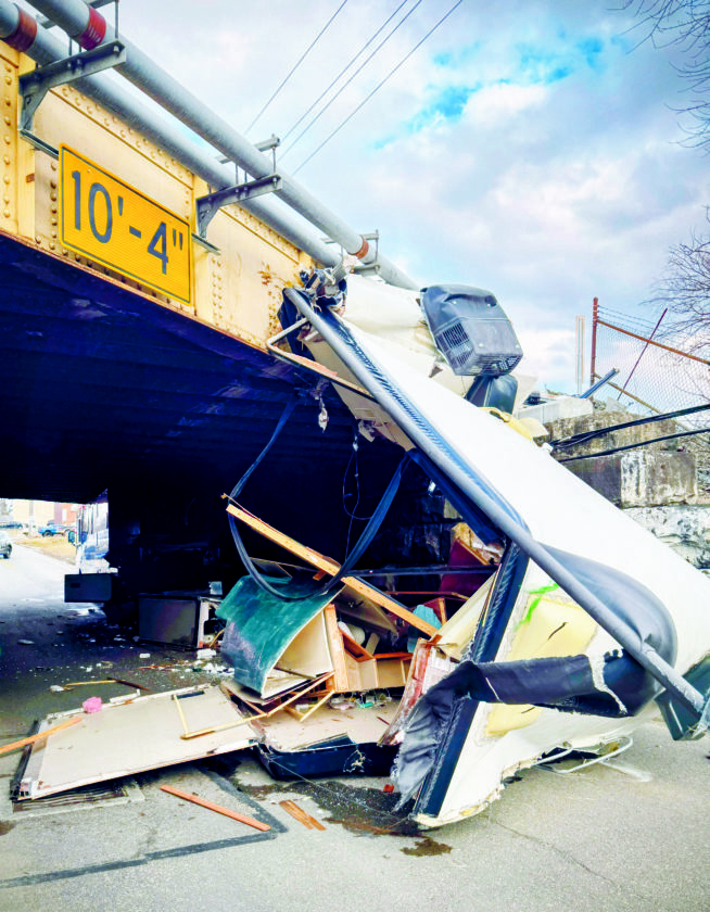 Columbiana residents have grown accustomed to motorists wedging their tractor trailers, buses and RVs under the Lisbon Street underpass in Columbiana after ignoring maximum height requirement signs. This is the aftermath of one such incident Friday afternoon when Kyle Smith of Eagleton Road in Lisbon wedged his RV beneath the underpass and causing disabling damage to the vehicle despite the signage. Police subsequently charged Smith with OVI and failure to maintain an assured clear distance. (Submitted photo)