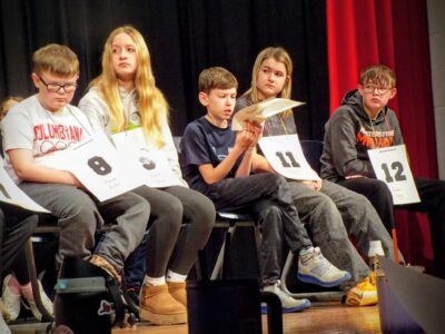 Columbiana Middle School spellers patiently wait for the start of the district’s spelling bee qualifier Wednesday afternoon. Pictured from left are fifth-grader Mason Erdel (8), seventh-grader Leighton Lalama (9), seventh-grader James Conrad (10), eighth-graders Addyson Price (11) and Easton Davis (12). Erdel bested Davis for fourth-place, sealing his advancement to the Columbiana. County Spelling Bee in March. (Photo by Stephanie Ujhelyi)