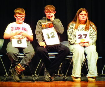 Competing for two final spots in the top five were fifth-grader Mason Erdel (8), eighth-grader Easton Davis (12) and seventh-grader Ruby Ellis (27). Erdel would snag the last spot advancing to the Columbiana County spelling bee in March and Davis would finish as the alternate. (Photo by Stephanie Ujhelyi)